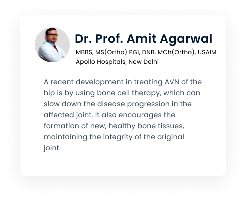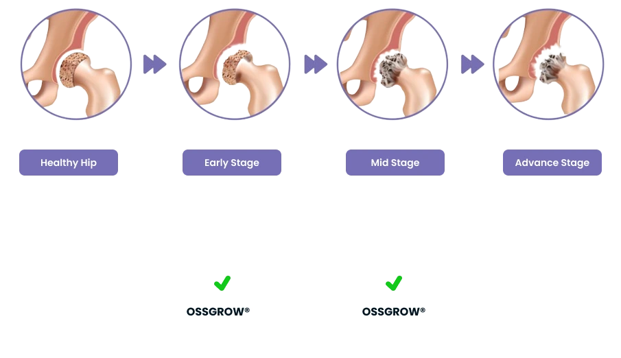 OSSGROW® is a specific bone-forming therapy option for curative treatment of early stages (up to Stage III) of AVN. The fresh and healthy bone-forming cells of OSSGROW® initiate new bone formation in the affected area. Slowly, the joint regains it structure, strength and function. If the hip has collapsed or necrotic zone is more than 50% of the hip joint, the outcomes are variable. However, patients with Stage 1& 2 have slightly better outcomes.